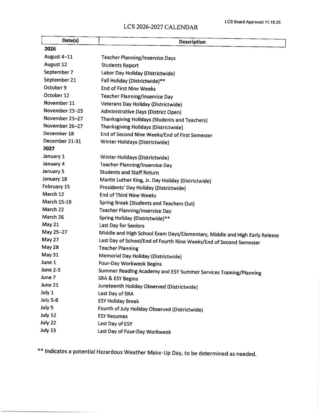 Leon County Schools Holidays Calendar 2026-2027