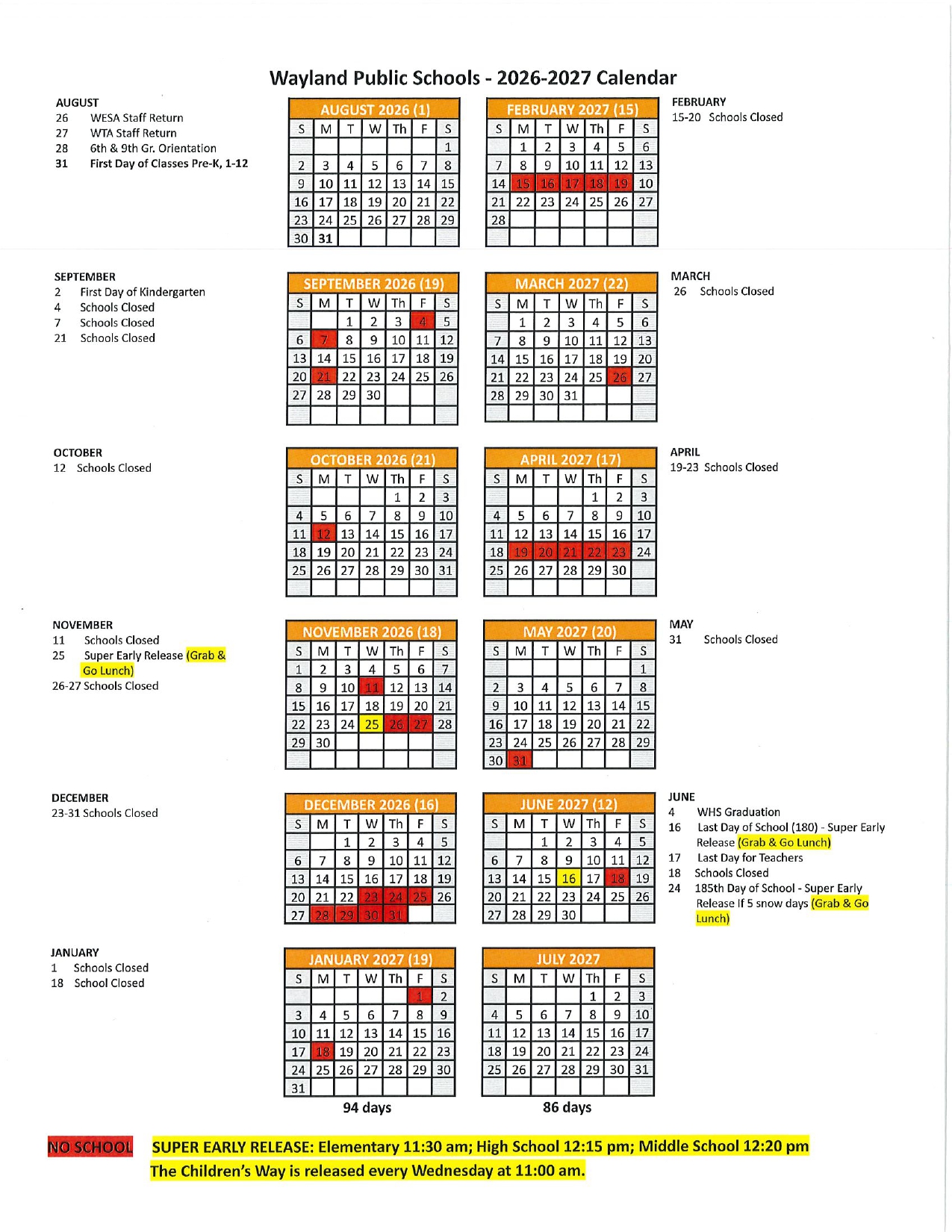 Wayland Public Schools Calendar 2026-2027