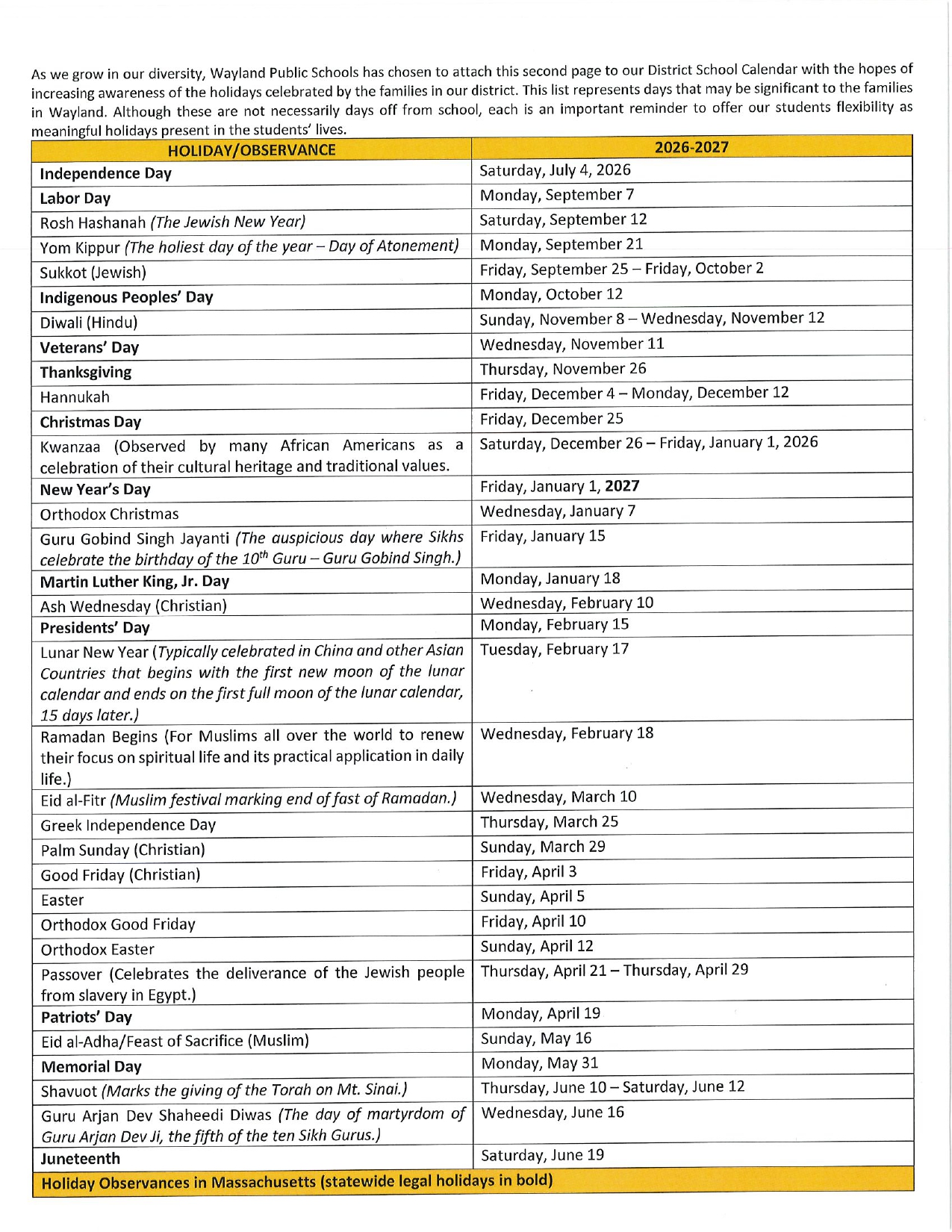 Wayland Public Schools Holidays 2026-2027